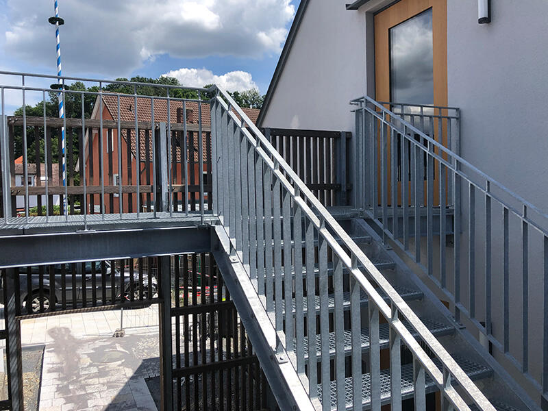 Hiermer plant, fertigt, liefert und montiert eine Fluchttreppe mit Lärchenholzverkleidung
