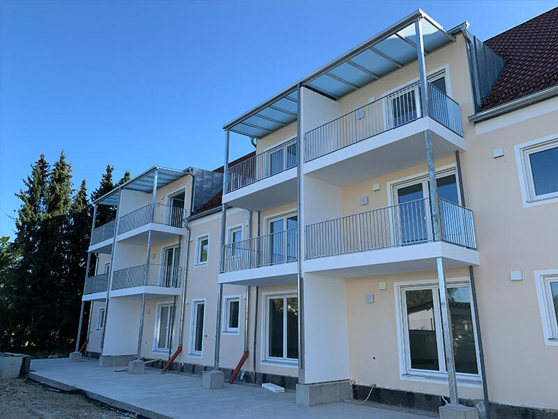 Hiermer plant, fertigt, liefert und montiert für einen Wohnkomplex Balkone mit Glasvordächern, französische Balkone und Innengeländer